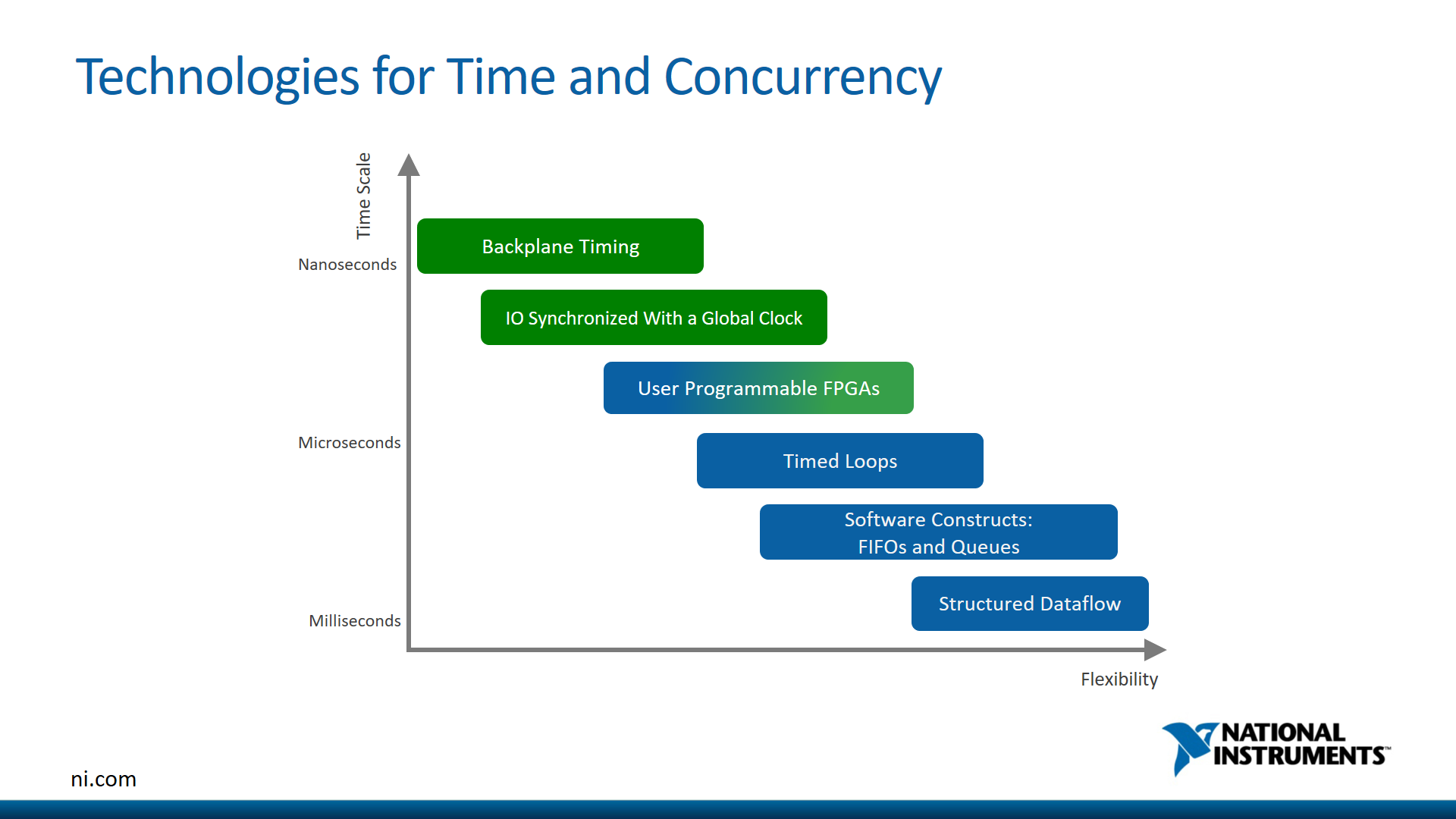“如图8中最上边的纳秒级别的Backplane同步技术,精确、时延低,但灵活性不高;又比如用于开发的LabVIEW软件,其内部的数据结构,特点是较高的延迟,却有很好的灵活性。我们需要针对不同的Timing场景,选择利用不同的技术。”姚远指出。