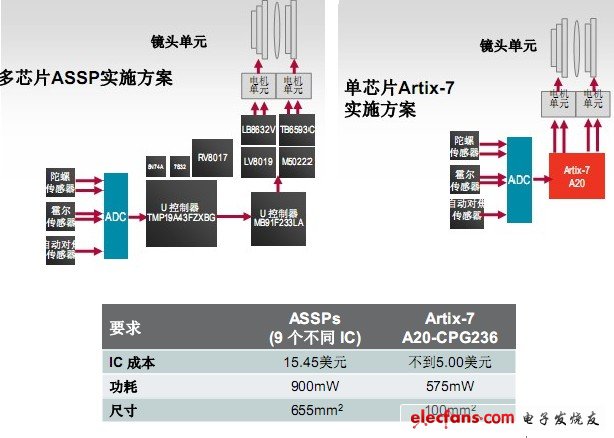 Artix-7 FPGA未出现以前,数码单反相机中要用是多个ASSP芯片。但是Xilinx Artix-7 FPGA的推出给数码单反相机带来了福音。单个Artix-7 FPGA就可代替9个ASSP,还可以显著降低成本、功耗和尺寸。其具体实施方案对比图如下图所示。两种方案不同的IC成本、功耗、尺寸规格如下表所示。